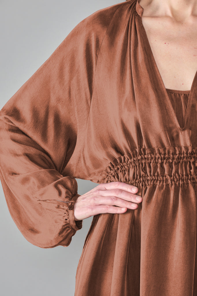 A Mini version of our favorite Apron Dress. Deep V neck. Apron layer front and back with double draw string. Gather close to the body or wear loose and relaxed. Raglan sleeve with button cuff. On seam pockets. Wear alone or pair with Trouser.