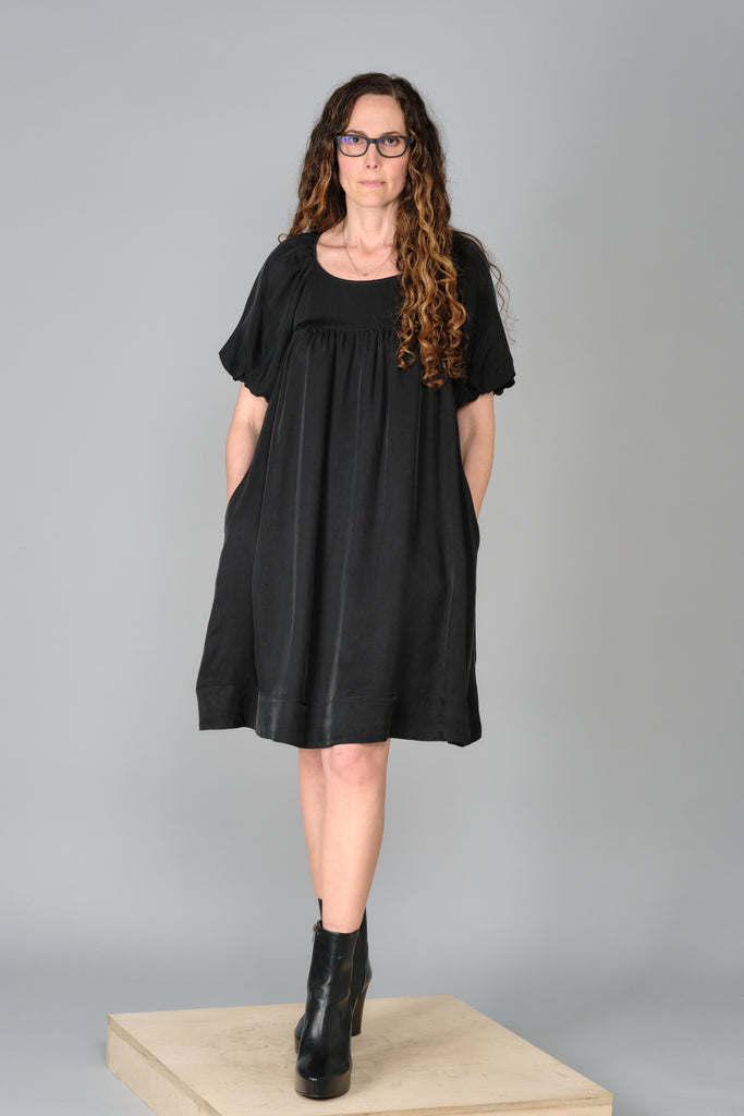 Sunday Dress. Wide scooped neck with button at back keyhole opening. Gathered elbow length balloon sleeves. Front and back neckline yoke. Side seam pockets. Wide hem. Fully Lined.