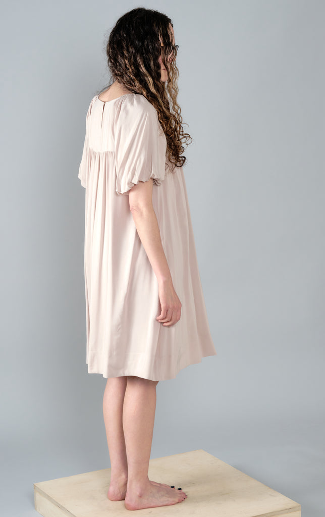 Sunday Dress. Wide scooped neck with button at back keyhole opening. Gathered elbow length balloon sleeves. Front and back neckline yoke. Side seam pockets. Wide hem. Fully lined.