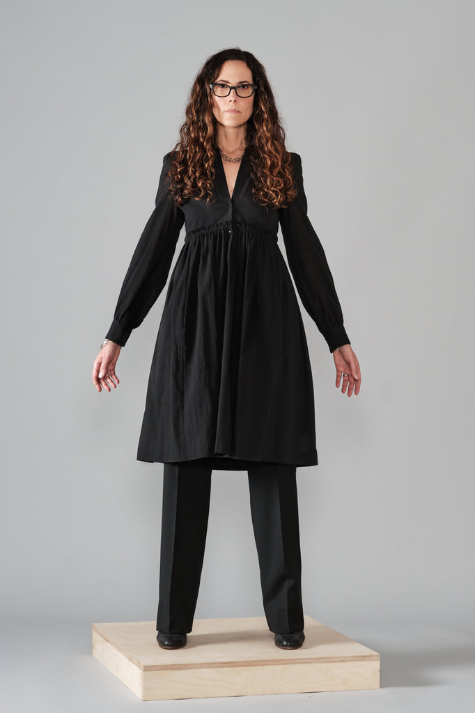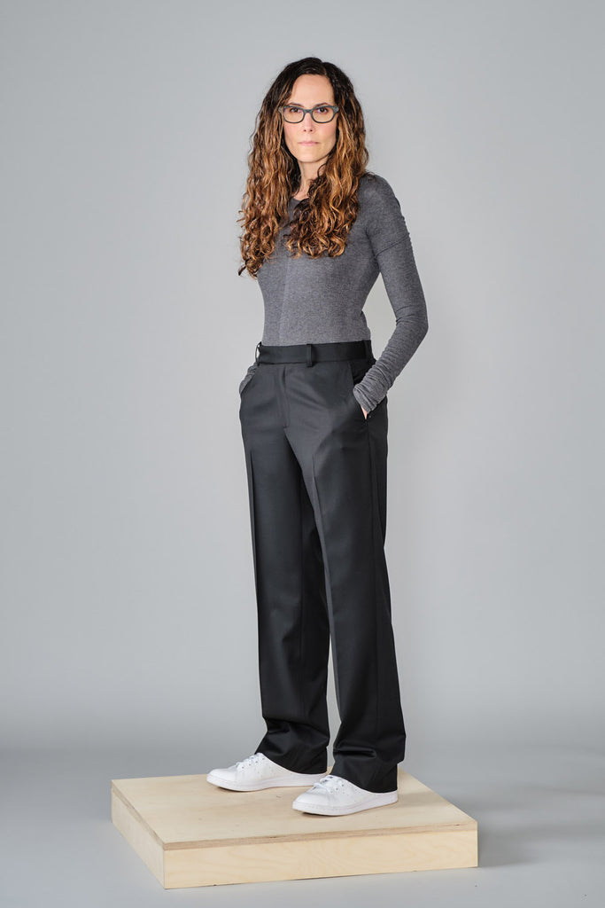 Menswear style constructed trousers. Straight leg. Back welt pockets. Mid rise. Longer length. Relaxed slouch.