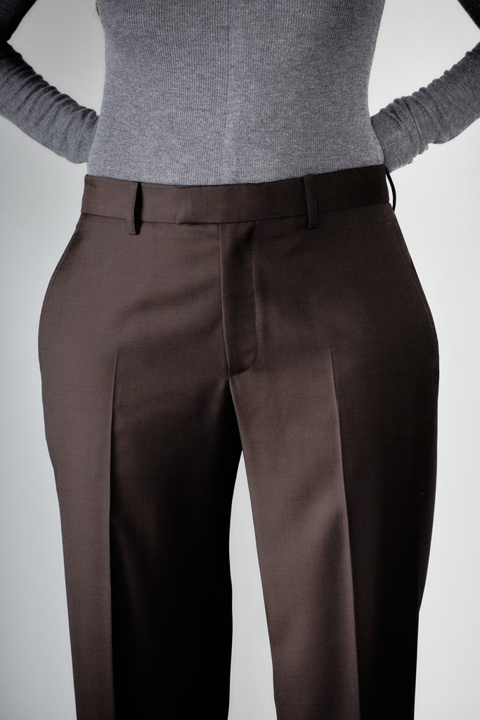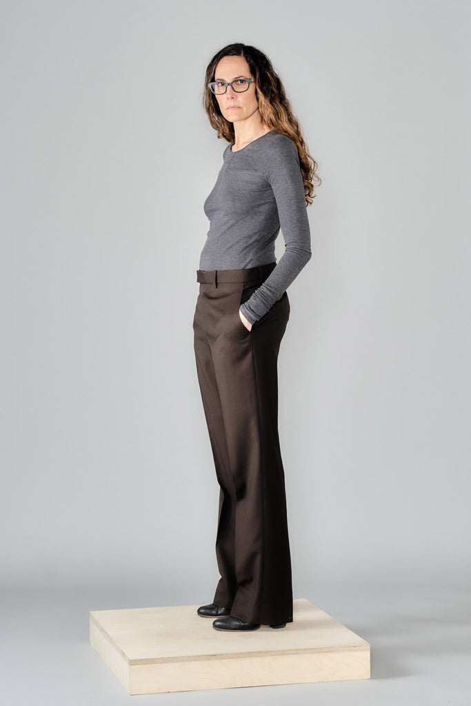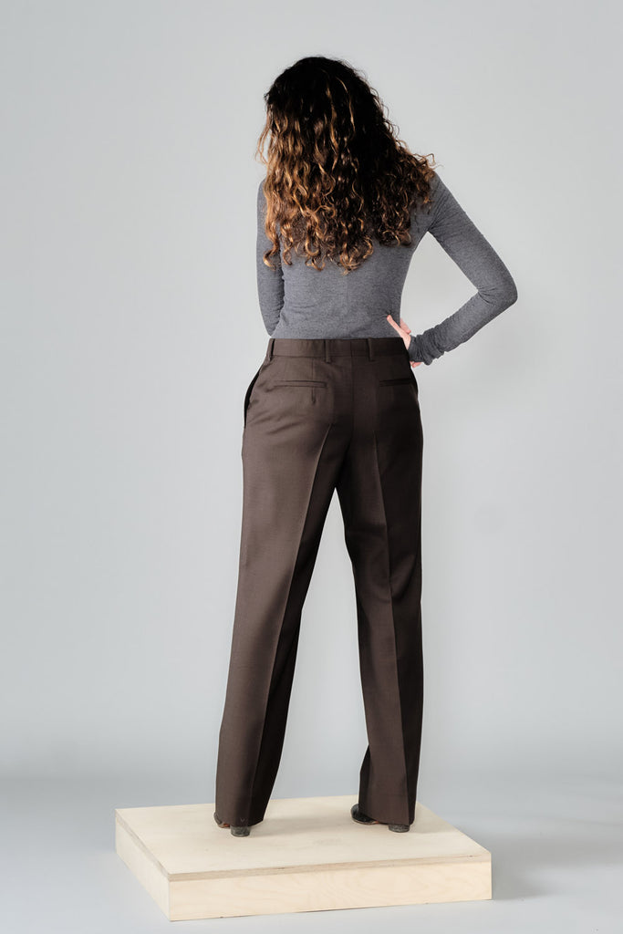 Menswear style constructed trousers. Straight leg. Back welt pockets. Mid rise. Longer length. Relaxed slouch.