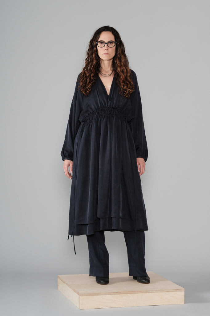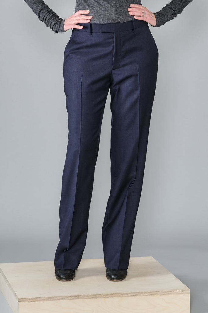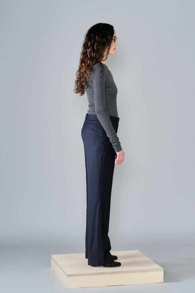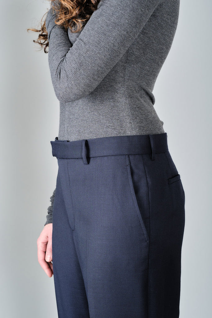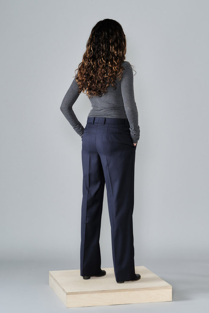 Menswear style constructed trousers. Straight leg. Back welt pockets. Mid rise. Longer length. Relaxed slouch.